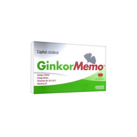 GinkorMemo 60 Capsules est un complément alimentaire avec ginkgo biloba, oméga 3, vitamines B6, B9, B12 et D3, qui aide à maintenir la mémoire avec l'âge et à préserver les fonctions cognitives.