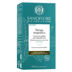 Sanoflore Magnifica Sérum Correcteur Global Anti-Imperfections Bio 30ml est efficace dès 7 jours sur les 5 types d'imperfections. Son efficacité est cliniquement prouvée : il agit contre les boutons, les marques rouges et résiduelles, les points noirs et resserres les pores.