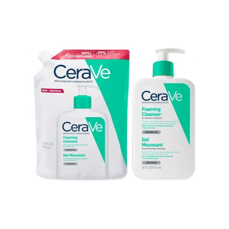 CeraVe Gel Moussant 473 ml + Éco-Recharge 473 ml est un gel moussant qui permet de nettoyer et éliminer l'excès de sébum sans altérer la barrière protectrice de la peau.