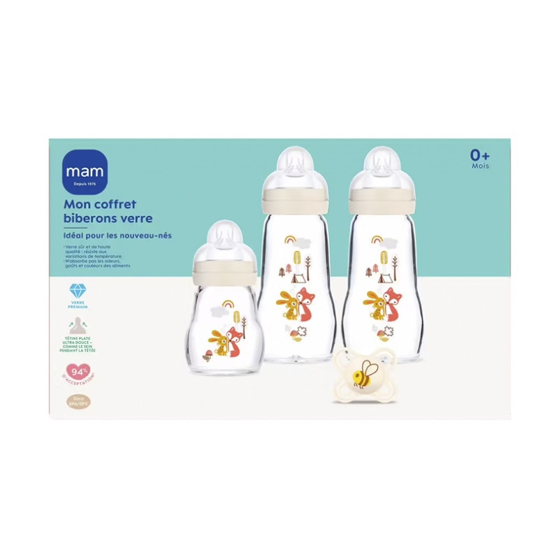 Le coffret biberons en verre de MAM contient 3 biberons en verre :