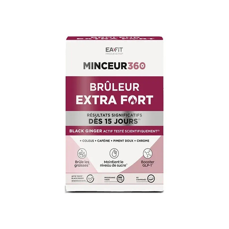Eafit Minceur 360 - Brûleur Extra Fort - Brûleur de graisses - Black Ginger, le seul brûleur testé scientifiquement grâce à un actif avec étude tendance Black Ginger, conçu pour vous aider à brûler les graisses et relancer votre perte de poids.