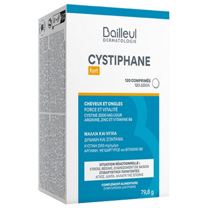 Bailleul-Biorga Cystiphane Fort Cheveux et Ongles 120 Comprimés est un complément alimentaire à base de cystine d'origine végétale, arginine, zinc et vitamine B6. Il est particulièrement recommandé en cas de situation réactionnelle : stress, régime, changement de saison.