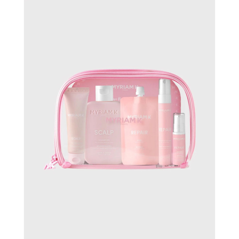 Votre rituel capillaire Myriam en 5 étapes, emballé dans une pochette de voyage pratique pour une beauté capillaire sans compromis, où que vous soyez.