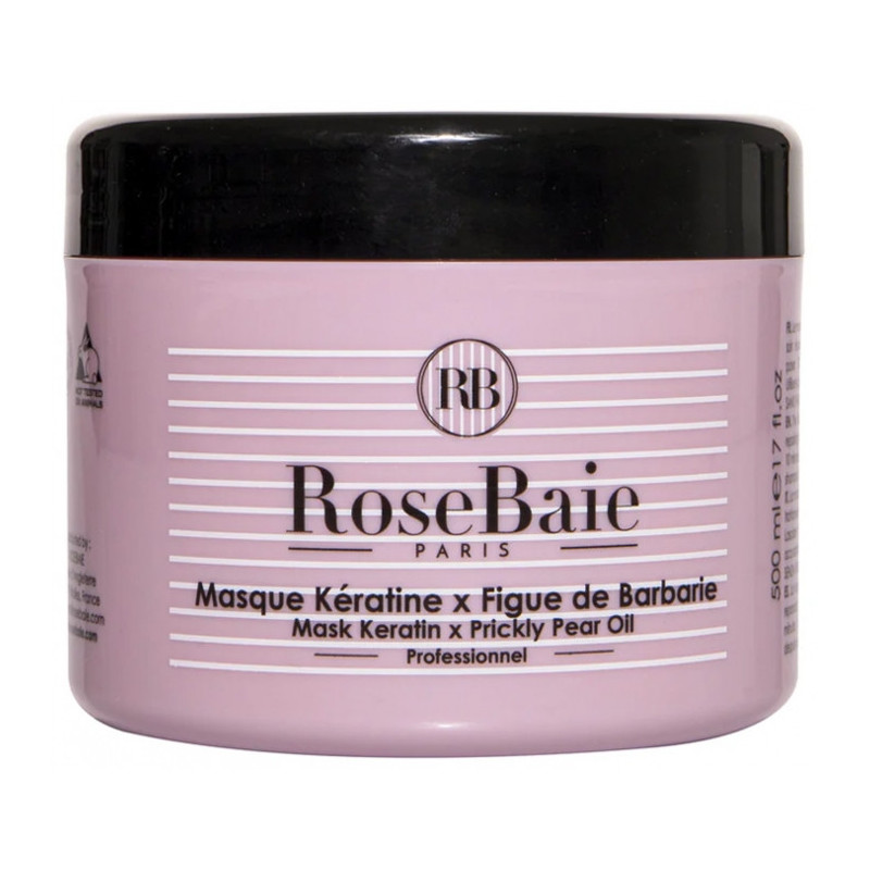 RoseBaie Masque Kératine x Figue de Barbarie 500 ml est un masque capillaire à l'ensemble d'actifs hydratants et fortifiants intenses pour tout type de cheveux.