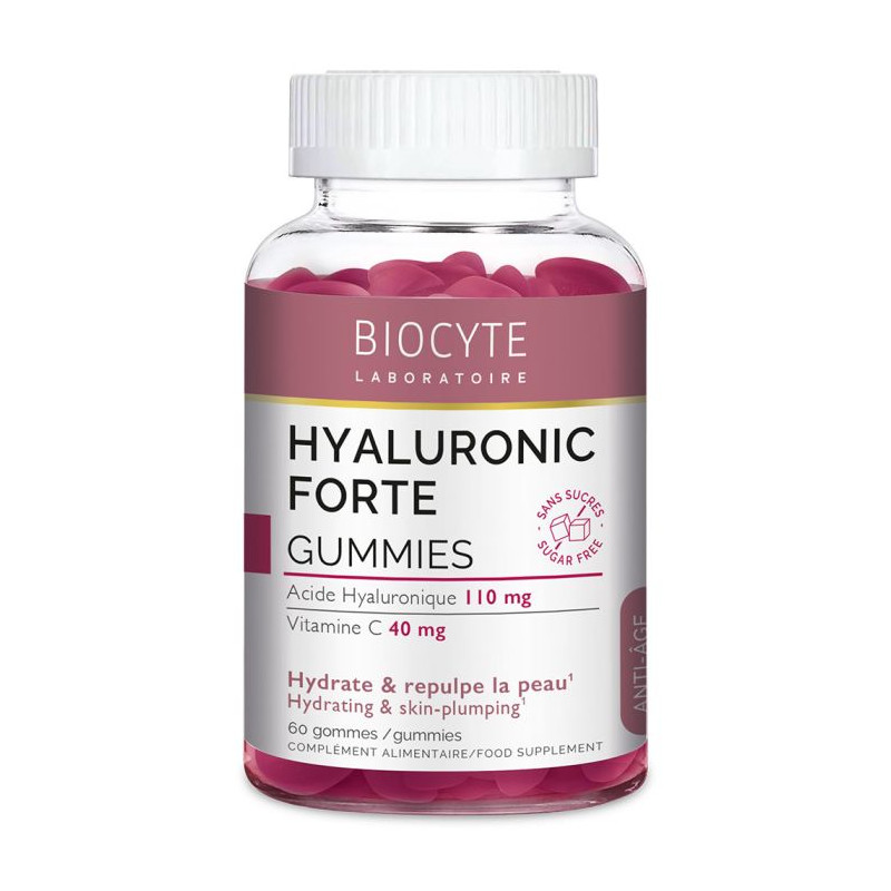 HYALURONIC FORTE GUMMIES est un complément alimentaire à base d'acide hyaluronique 110 mg, de vitamine C 40 mg et de vitamine B3 pour hydrater et repulper la peau. La formule est vegan, sans sucres au goût agréable et naturel de cerise.