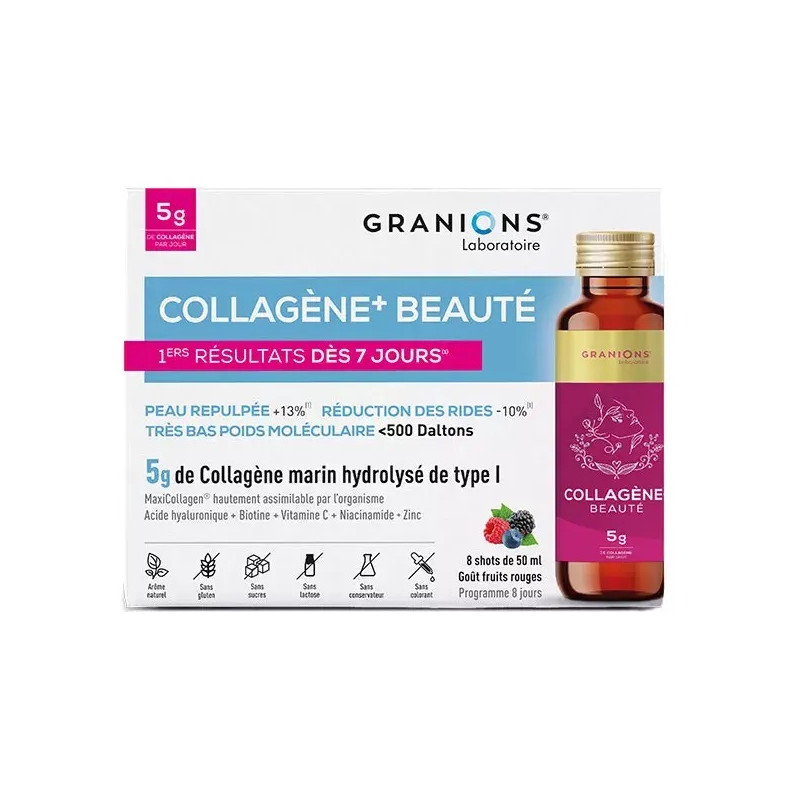 Le collagène marin de type I hydrolysé Maxicollagen® contenu dans les shots Collagène+ Beauté est un collagène de 3ème génération à l'éfficacité cliniquement prouvée. Les premiers résultats sont visibles dès 7 jours de cure : réduction de la quantité de rides, augmentation de l'hydratation de la peau et de la densité de collagène. Le Maxicollagen® est hautement hydrolisé, avec des peptides de collagène de très bas poids moléculaire <500 daltons, offrant une meilleur assimilation et une éfficacité rapide. Le produit ne contient pas de conservateurs grâce à un procédé de pasteurisation qui assure sa conservation.