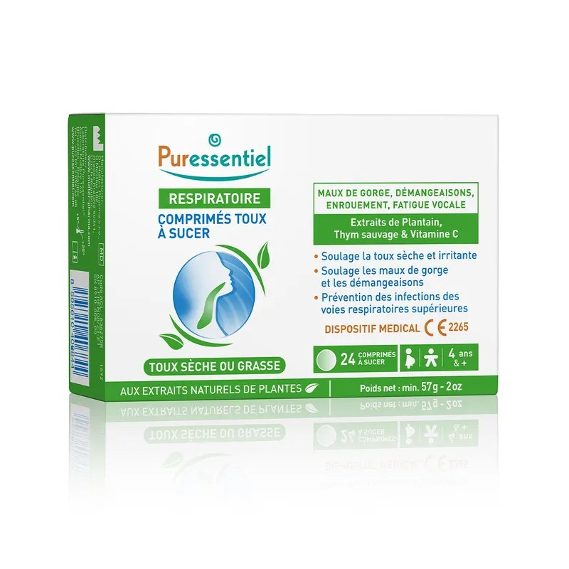 Ce dispositif médical associe les bienfaits du Plantain, du Thym sauvage et de la vitamine C . Cette formule naturelle apaise la toux sèche et irritante en calmant les irritations et démangeaisons de la gorge. En cas de toux grasse, ces comprimés facilitent l'expectoration, aidant à dégager les voies respiratoires et à éliminer les sécrétions.