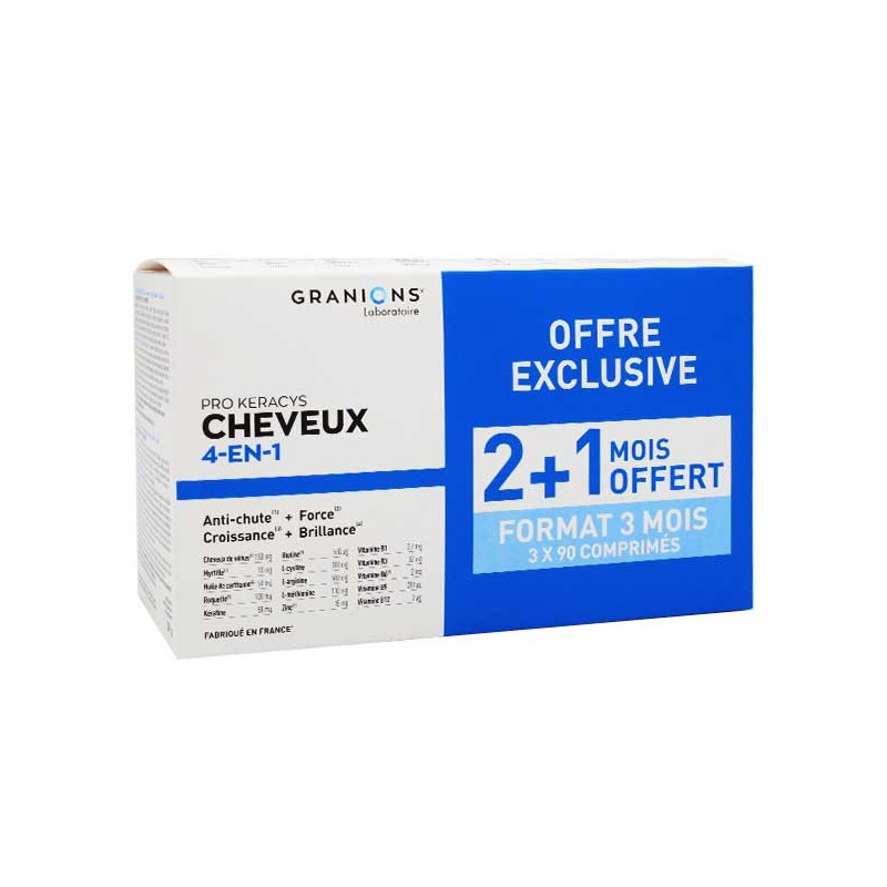Afin de conserver une chevelure seine et forte, le Laboratoire des GRANIONS® a développé une formule 4 EN 1 afin d’agir sur ces différents facteurs :