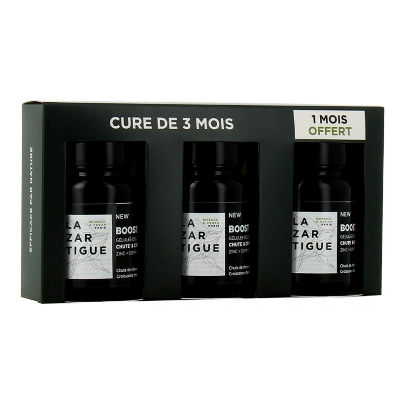 Lazartigue Boost Chute & Croissance Lot de 3 x 30 Gélules est un complément alimentaire qui aide à freiner la chute de cheveux progressive comme réactionnelle et stimule la croissance en associant la puissance d'extrait botaniques à un complexe minéral et vitaminique