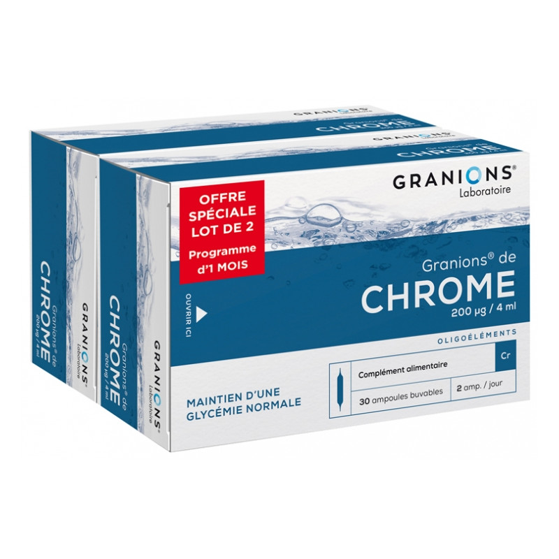 Granions de Chrome 200mcg contient 200 micro-grammes de chrome pour 2 ampoules.