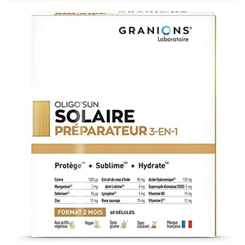 1 gélule par jour au cours d'un repas, 1 mois avant l'exposition au soleil, pendant l'exposition solaire et 1 mois après le retour pour prolonger l'effet.