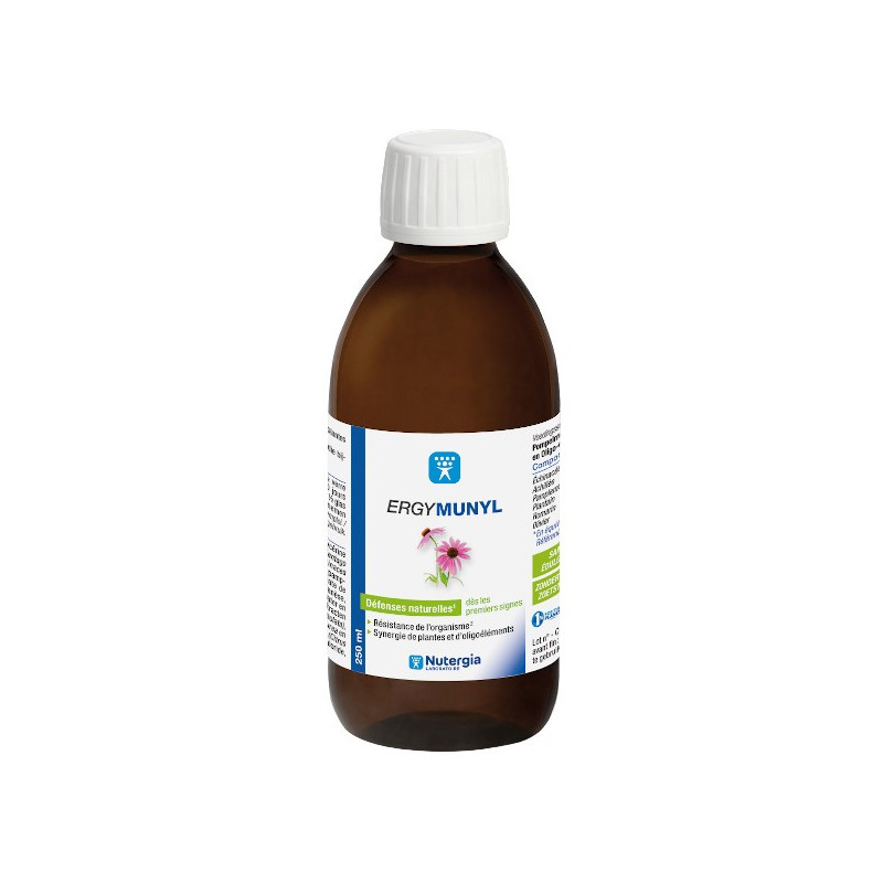 ERGYMUNYL est composé d’échinacée, plantain, romarin et pamplemousse qui sont traditionnellement reconnus pour contribuer à la défense de l’organisme ; plantain, achillée et échinacée ont aussi une action au niveau des voies respiratoires.