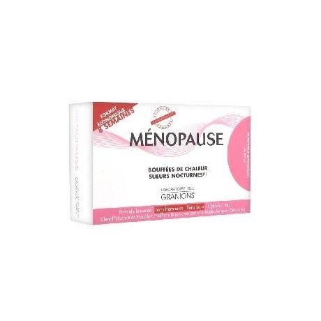 Toutes les femmes connaissent les bouffées de chaleur et les sueurs nocturnes qui apparaissent parfois dès la quarantaine et qui sont les principaux troubles caractéristiques de la pré-ménopause et de la ménopause. Granions Ménopause 56 Gélules est un complément alimentaire qui aide à lutter naturellement contre les bouffées de chaleur et les sueurs nocturnes. Sa formule unique associe 2 actifs : - la Sésamine (lignane de sésame), - la 8-Prénylnaringénine, issue des polyphénols du Lifénol (extrait de houblon). Formule brevetée, sans hormones, sans soja. Format économique 8 semaines.