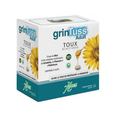 Grintuss adult comprimés est réalisé à travers des processus innovants d'extraction et de production qui permettent de concentrer les fractions polysaccharidiques, de résines et flavonoïques responsables de l'action muco-adhésive et protectrice de la muqueuse.