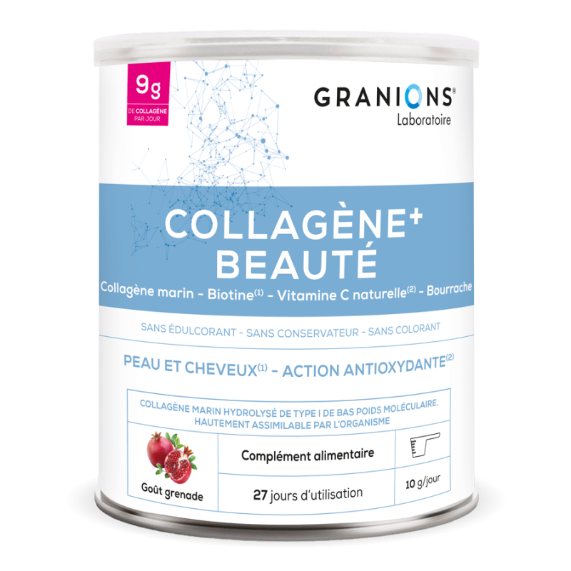 Le Laboratoire des GRANIONS a développé un complexe à base de Collagène en poudre hautement concentré et d’acide hyaluronique. L’association de la Vitamine C, puissant antioxydant et de la Biotine, qui contribue à la beauté de la peau et des cheveux, complètent la formule pour une action optimale.