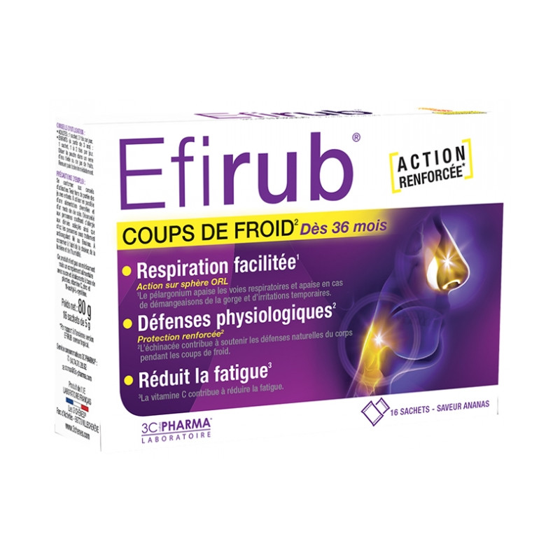 3C Pharma Efirub Coups de Froid Goût Ananas 16 Sachets est un complément alimentaire avec sucre et édulcorants à base de plantes, vitamine C, zinc et N-acétyl-L-cystéine.