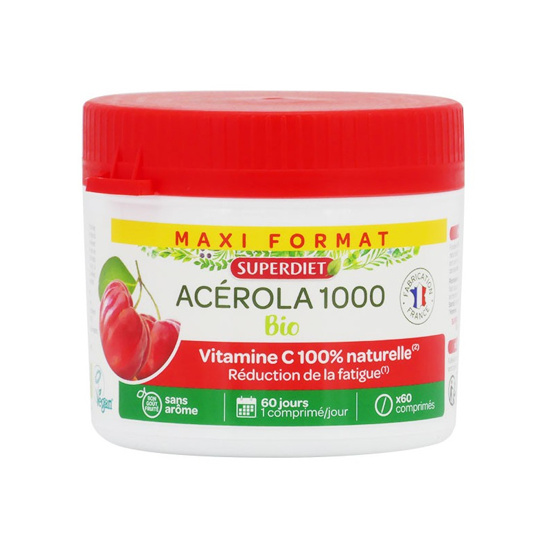 Superdiet Acérola 1000 Bio 60 Comprimés est un complément alimentaire à base d'acérola titrée en vitamine C, qui contribue à réduire la fatigue.