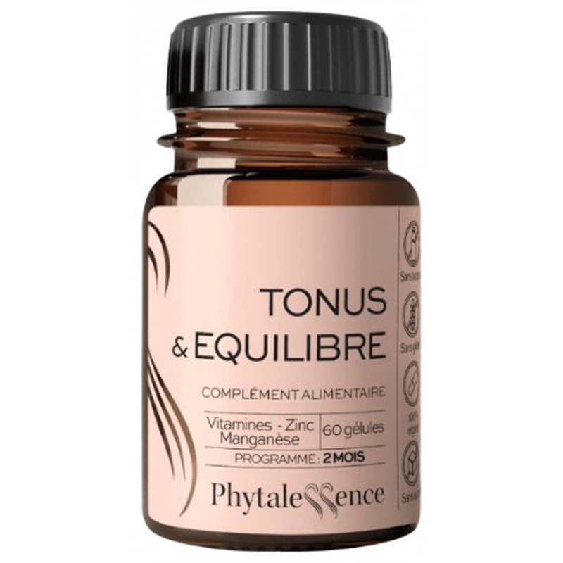 Phytalessence Tonus & Équilibre 60 Gélules est un complément alimentaire à base de vitamines, de zinc et de manganèse.