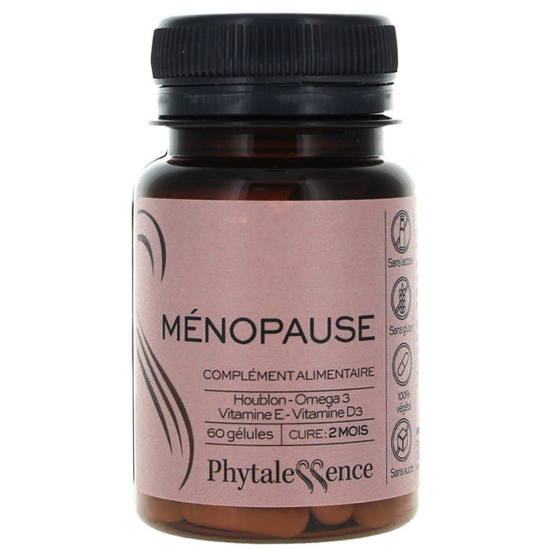 Phytalessence Ménopause 60 Gélules est un complément alimentaire à base d'houblon, oméga 3, vitamines E et D3.