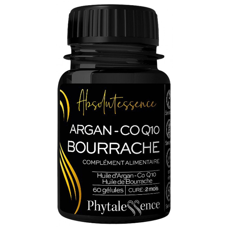 Phytalessence Argan Bourrache CO Q10 60 Gélules est un complément alimentaire à base d'huile d'argan, d'huile de bourrache et de coenzyme Q10.