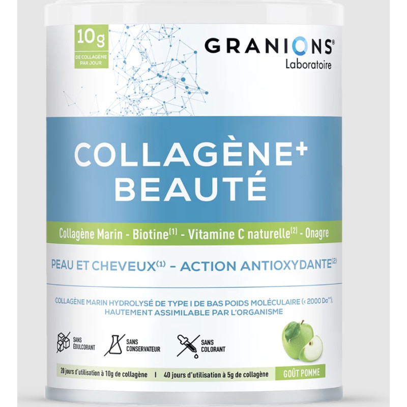 Le Laboratoire des GRANIONS® a développé un complexe à base de Collagène en poudre hautement concentré et d’acide hyaluronique. L’association de la Vitamine C, puissant antioxydant et de la Biotine, qui contribue à la beauté de la peau et des cheveux, complète la formule pour une action optimale.