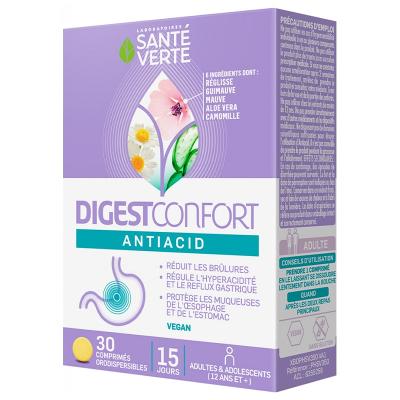 Santé Verte DigestConfort Antiacid 30 Comprimés Orodispersibles est un dispositif médical indiqué pour soulager les brûlures, la sensation d'acidité et les douleurs d'estomac causées par l'irritation de la muqueuse gastrique. Il est aussi recommandé dans le traitement du reflux gastro-œsophagien pour en réduire les symptômes, tels que la régurgitation acide, le pyrosis, la mauvaise digestion (dyspepsie) associée au reflux, les œsophagies de reflux, la toux, la déglutition difficile, la dysphonie ainsi que toutes les régurgitations ayant comme cause le reflux gastrique.