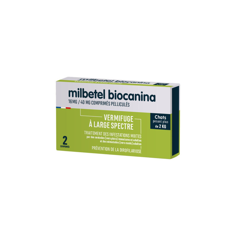 Le vermifuge Milbetel de Biocanina est un puissant antiparasitaire qui viendra a bout des vers ronds et des vers plats de votre chat. Au bon goût de viande, ce vermifuge assurera une protection longue durée à votre chat. Ce vermifuge convient pour les chats de plus de 2kg et comprend 2 comprimés.