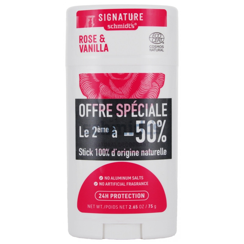 Schmidt's Signature Désodorisant Stick Naturel Rose et Vanille Lot de 2 x 75 g est un duo de déodorant efficace et 100% d'origine naturelle, sans sels d'aluminium.