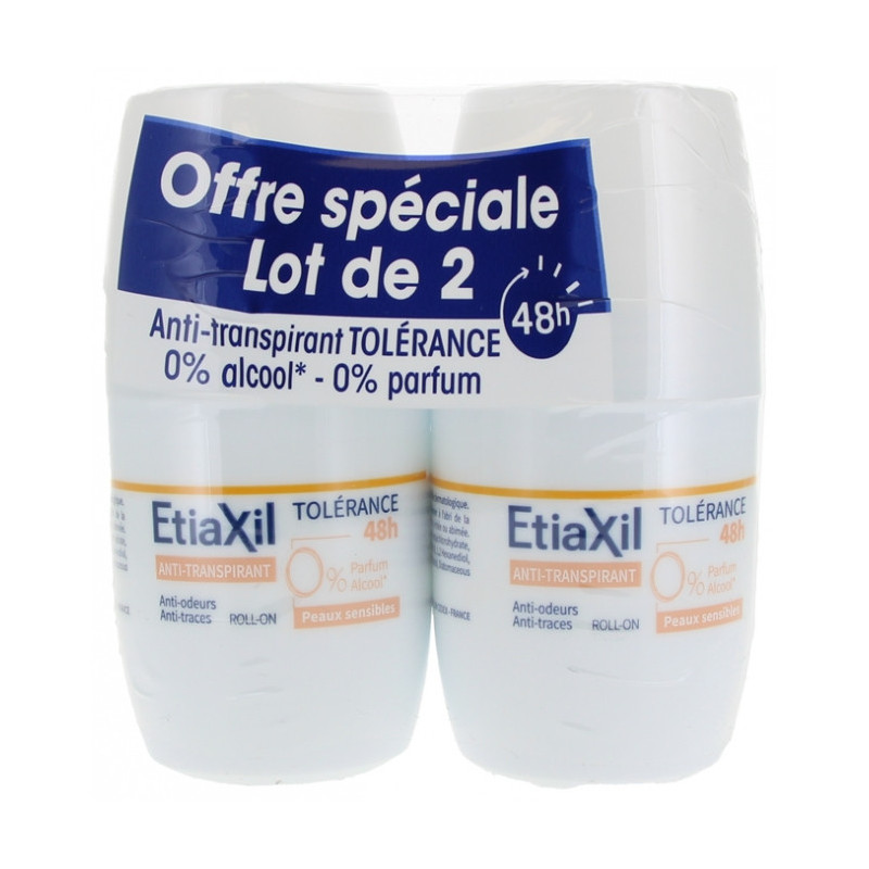 Etiaxil Tolérance Anti-Transpirant Peaux Sensibles 2 x 50 ml est un anti-transpirant en roll-on pour les peaux sensibles.