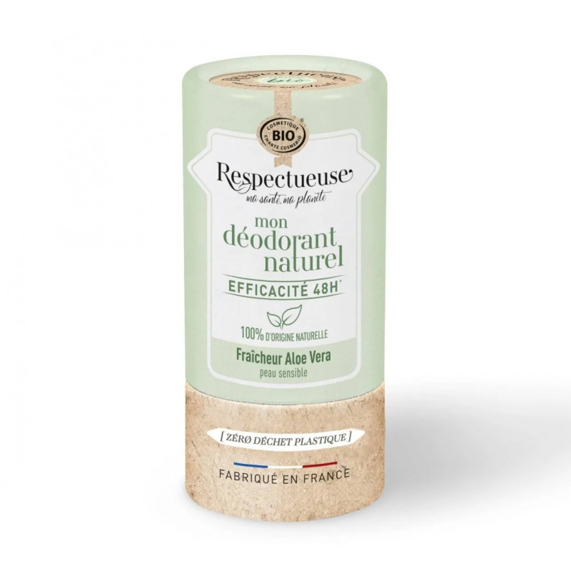 Le Déodorant Solide Fraîcheur Aloe Vera à efficacité 48h de Respectueuse protège des odeurs de transpiration et absorbe l'humidité.