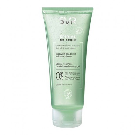 SVR crée SPIRIAL Déo-douche, le 1er* gel lavant déodorant fraicheur intense à l’efficacité 24 heures*. Il assainit la peau et laisse une sensation de propre toute la journée. Les agents anti-bactériens contenus dans son complexe probiotique luttent contre les odeurs corporelles tout en maintenant l'équilibre de la flore cutanée. Formulé au pH physiologique, sans savon, sans alcool et sans sels d’aluminium, il est adapté aux peaux sensibles.