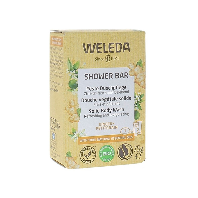 Faites-le plein d’énergie et donnez-vous un coup de boost grâce au cocktail revigorant de Gingembre épicé et des nuances fraîches et citronnées de Weleda Shower Bar Douche Végétale Solide Ginger & Petitgrain Bio 75g.