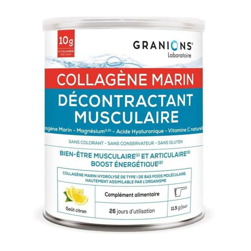 Une formule complète pour le bien être des muscles et des articulations, Le Granions® Décontractant musculaire Collagène marin contribue à la récupération musculaire, à renforcer les tendons et ligaments et à prévenir les blessures et les courbatures grâce à des actifs de qualité et hautement dosés. Du collagène marin. De la Vitamine C, d'origine naturelle, provenant de l'Acérola. 225 g de Magnésium et de l'Acide Hyaluronique pour compléter la formule.