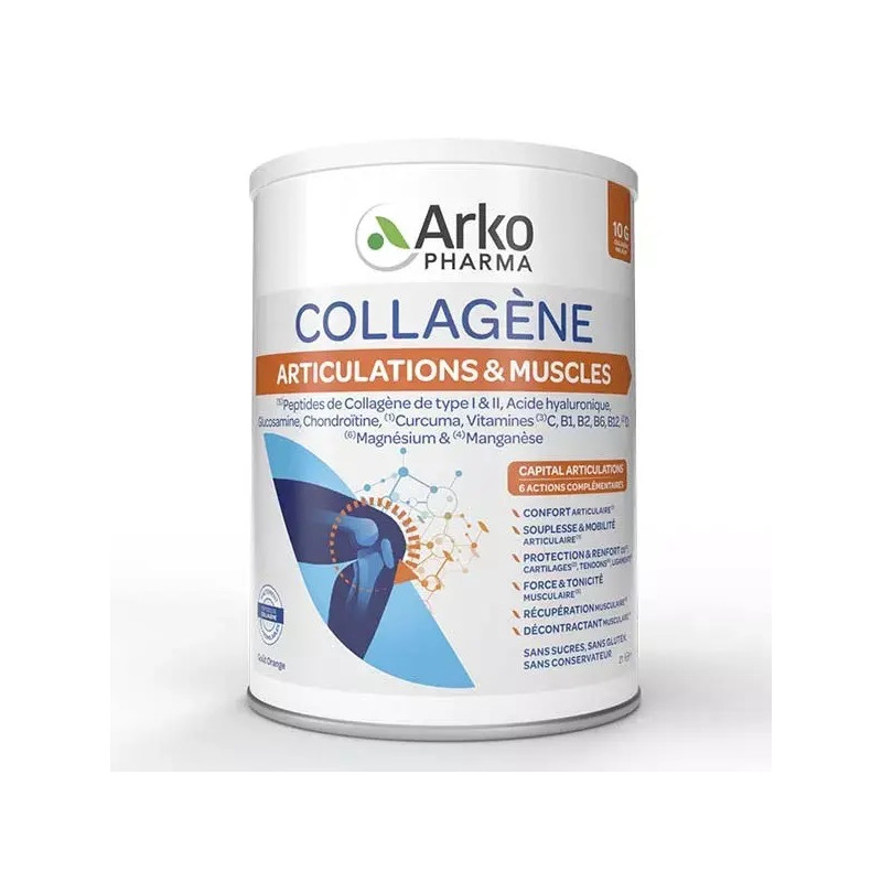 Peptides de collagène de type I et de type II - Maltodextrine - Carbonate de magnésium - Chlorhydrate de glucosamine - Chondroïtine sulfate de sodium - Acidifiant : acide citrique - Arôme naturel (goût orange) - Colorant d'origine végétale : bêtacarotène - Vitamine C - Hyaluronate de sodium - Extrait de rhizome de curcuma (Curcuma longa L.) - Édulcorant : sucralose - Gluconate de manganèse - Vitamine B12 - Vitamine D3 - Vitamine B6 - Vitamine B2 - Vitamine B1.