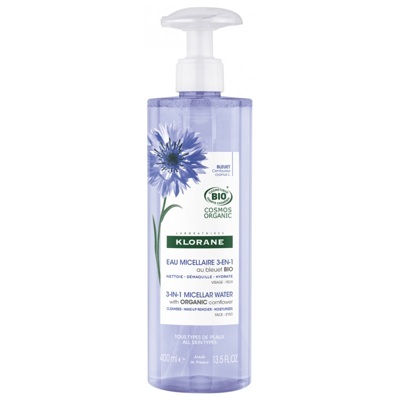 Klorane Eau Micellaire 3en1 au Bleuet Bio 400 ml est une eau micellaire à la triple efficacité nettoyante, démaquillante et hydratante. Au bleuet Bio et enrichie en agents hydratants (aloe vera, glycérine végétale), elle élimine délicatement le maquillage du visage et des yeux sans dessécher la peau.