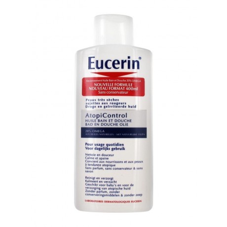 Eucerin AtopiControl Huile Bain et Douche 400 ml usage quotidien nettoie en douceur, calme et apaise les peaux très sèches sujettes aux rougeurs et les peaux à tendance atopique comme celle du nourrisson.