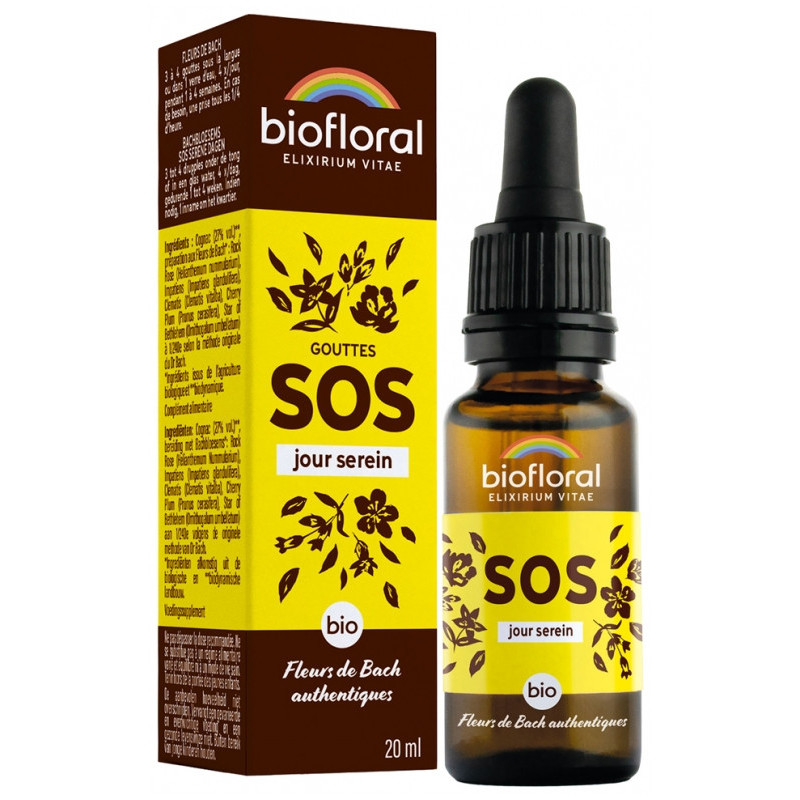 Biofloral Gouttes SOS Jour Serein Bio 20 ml est un complément alimentaire à base de fleurs de Bach pour permettre d'affronter les épreuves du quotidien en toute sérénité : rendez-vous importants, examens, moments de panique, bouleversements émotionnels...