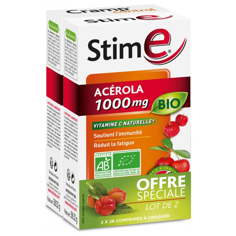 Nutreov Stim E Acérola 1000 mg Bio Lot de 2 x 28 Comprimés à Croquer est un complément alimentaire à base de vitamine C 100% d'origine naturelle et au subtil goût de citron qui soutient l'immunité et réduit la fatigue.