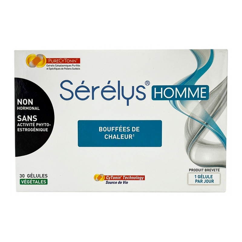 Sérélys Homme Bouffées de Chaleur 30 Gélules Végétales est un complément alimentaire non hormonal et sans activité phytoestrogénique pour les hommes en période d'andropause. Durant cette période, l'homme subit une diminution de ses hormones. Ce phénomène peut entraîner des bouffées de chaleur, sueurs nocturnes, insomnies, fatigue et prise de poids.