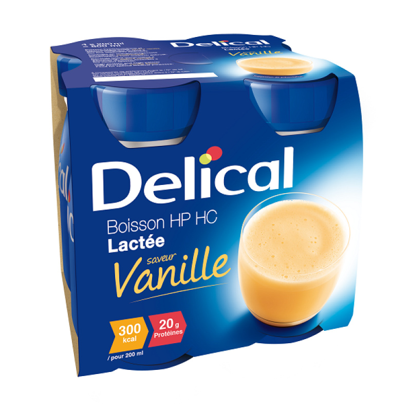 La marque Delical propose des compléments alimentaires nutritionnels indiqués en cas de dénutrition avérée ou en prévention d'un état de dénutrition. Delical Boisson HP/HC est une boisson lactée enrichie en protéines (hyperprotéinés) et en calories (hypercaloriques), elle apporte 360 kcal et 20 g de protéines par portion de 200 ml. Facile à boire, cette boisson prête à l’emploi possède une saveur vanille.