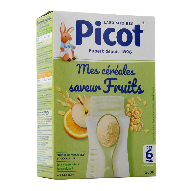 Les "MES CEREALES FRUITS DES 6 MOIS" de Picot sont des céréales instantanées spécialement élaborées pour les bébés dès l'âge de 6 mois. Elles constituent une source essentielle de vitamines (A, D, C, B3, B6 et B9) ainsi que de calcium, indispensables à la croissance et au développement de votre bébé.