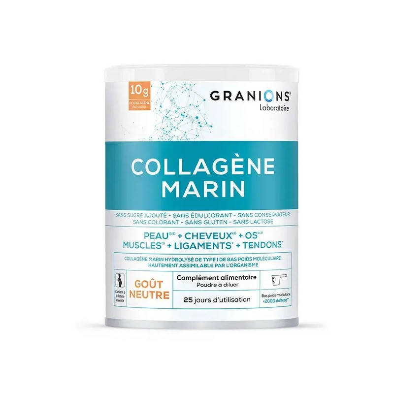 Le Laboratoire des Granions® a développé une formule hautement dosée, qui apporte 10g de collagène par portion journalière. Pour permettre une assimilation optimale par l’organisme, notre collagène marin de type I est hydrolysé en peptides de bas poids moléculaire (inférieurs à 2000 daltons). La formule contient également de la vitamine C naturelle, issue d’acérola. Cette synergie offre une action à plusieurs niveaux :