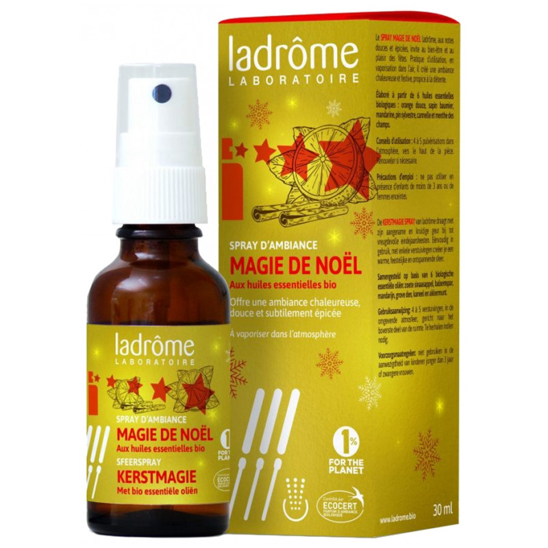 Ladrôme Spray d'Ambiance Magie de Noël Bio 30 ml est un spray d'ambiance aux notes douces et épicées, qui invite au bien-être et au plaisir des fêtes.
