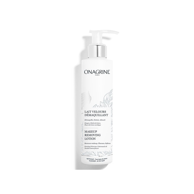 Onagrine Lait Démaquillant Velours 200ml est une eau lactescente au toucher soyeux, elle démaquille et nettoie parfaitement le visage.