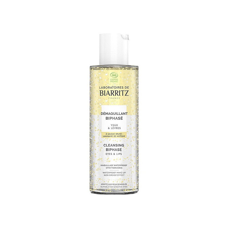 Sans frotter et sans laisser de film gras, le Démaquillant biphasé yeux & lèvres certifié bio des Laboratoires de Biarritz élimine rapidement le maquillage, même le plus tenace, autour des yeux ou sur les lèvres. Exit le maquillage waterproof, longue tenue ou sans transfert ! Sa formule combine une phase huileuse enrichie à l'huile de ricin, pour un démaquillage en douceur, et une phase aqueuse enrichie en actifs apaisants et hydratants. On retrouve dans sa composition l'actif phare de la gamme Nettoyants-Démaquillants, la Laminaire de Neptune (extrait d'algue brune), qui diminue les sensations de tiraillements et ravive l'éclat de la peau. Sans parfum ni conservateur synthétique, le démaquillant biphasé convient à tous les types de peau, y compris aux yeux sensibles : il ne pique pas les yeux ! Sa formule vegan et certifiée bio convient également aux femmes enceintes et allaitantes.
