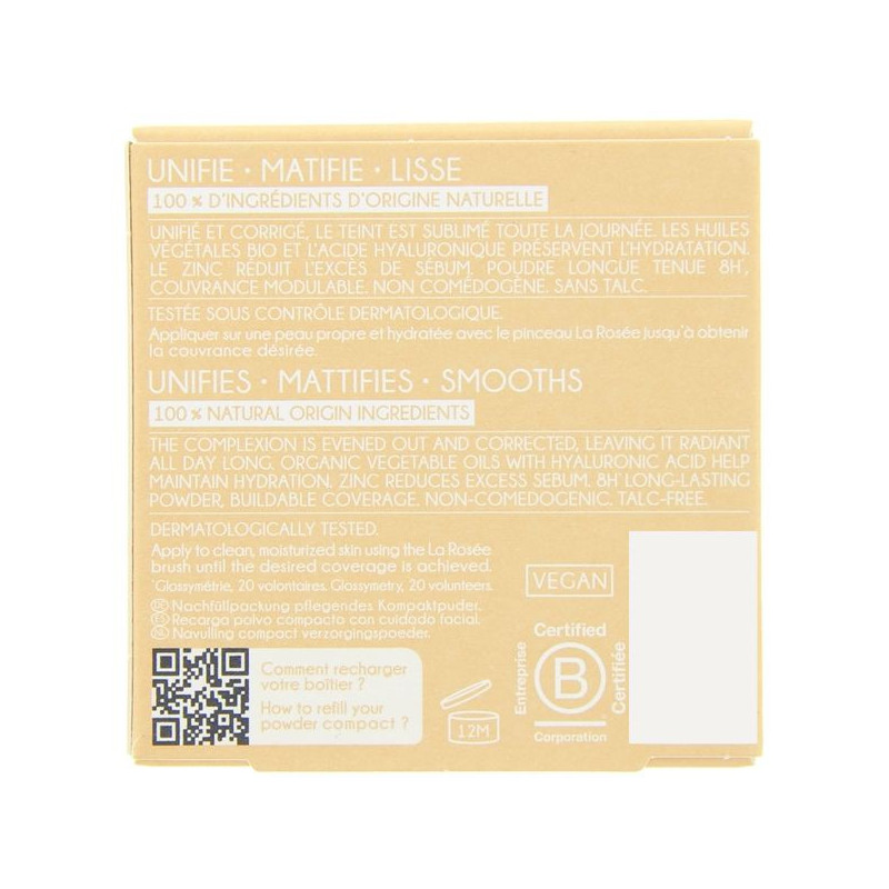 Unifié et corrigé, le teint est sublimé toute la journée. Les huiles végétales Bio et l'acide hyaluronique préservent l'hydratation. Le zinc réduit l'excès de sébum. Poudre longue tenue 8h, couvrance modulable non comédogène, sans talc.
