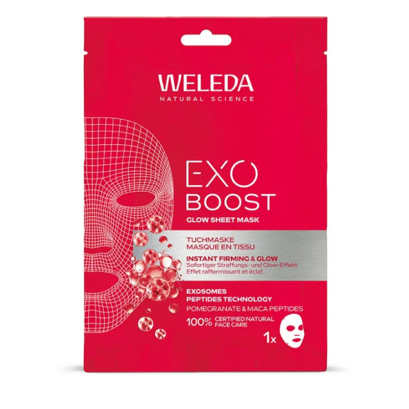 Weleda Exo Boost Glow Masque en Tissu Grenade et Peptides de Maca est le soin express idéal pour un éclat immédiat et une peau visiblement raffermie. Alliant innovation technologique et actifs naturels, ce masque redonne à la peau toute sa vitalité en quelques minutes seulement.