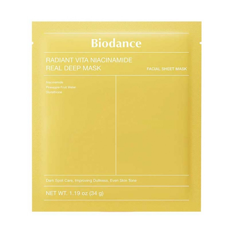 Biodance Radiant Vita Niacinamide Real Depp Masque 34 g unifie le teint, exfolie en douceur et renforce la barrière cutanée pour une peau lumineuse et équilibrée.