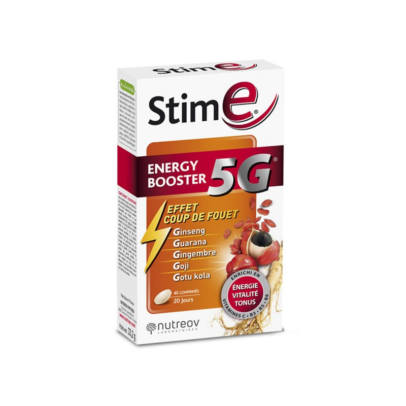 Issu de la recherche des laboratoires Nutreov, Stim e® ENERGY BOOSTER 5G®, véritable cocktail de vitalité nouvelle génération hautement dosé, regroupe :