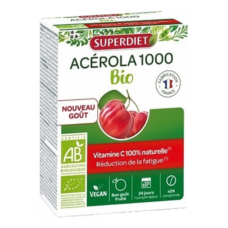 Superdiet Acérola 1000 Bio 24 Comprimés Sécables à Croquer est un complément alimentaire à base d'acérola, baie rouge choisie pour sa richesse en vitamine C d'origine naturelle qui aide à réduire la fatigue.